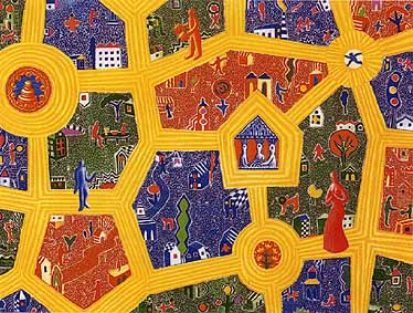 舞台の上で踊り演じるキャスト(配役)を 綿引明浩独特の銅版画は、ポップな色彩とユーモアとエスプリのきいた構成で多くのファンを楽しませてくれます。