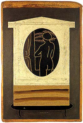 作者独自のマチエールがボックスアートのような立体的構成を平面に置き換え、現代的な表現手段をとりながら、どこか古典的な懐かしさを感じさせる不思議な画面である。