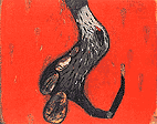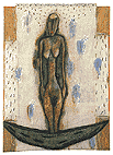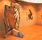 三十代初め、動物を擬人化した緻密なテンペラ画でデビューしたが、その後大きく変貌し、人物をデフォルメした自由な構成となり、その変化は、安井賞以降も続いている。素材も画風同様に自由なものとなり、今回は、彫刻された木材を下地に古い和紙を張り込み、穴を開けたり、焼いたりと立体的な表現を施し、一か所にとどまらない小林裕児の魅力を存分に見せてくれる。