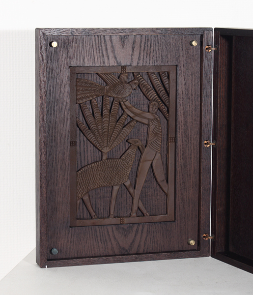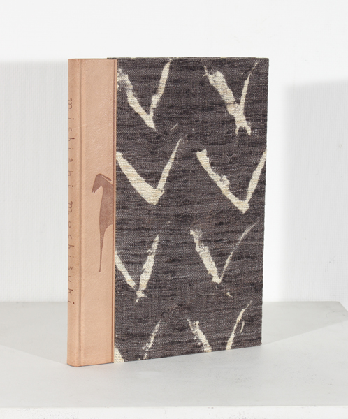 望月通陽作品集 円周の羊-愛蔵版- 1996年 ブロンズレリーフ:18.5×26cm ED:25/100 作者手染め印度絹布・羊革背継ぎ厚表紙丸背装/ オリジナル・ブロンズレリーフ/ レリーフ額装〔開き置き式〕特装木箱入り/ 限定版100部(番号入り) Sold